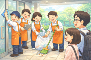 ・施設外就労: チームで協力して行う清掃業務など